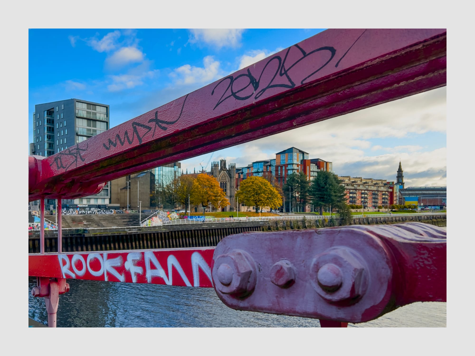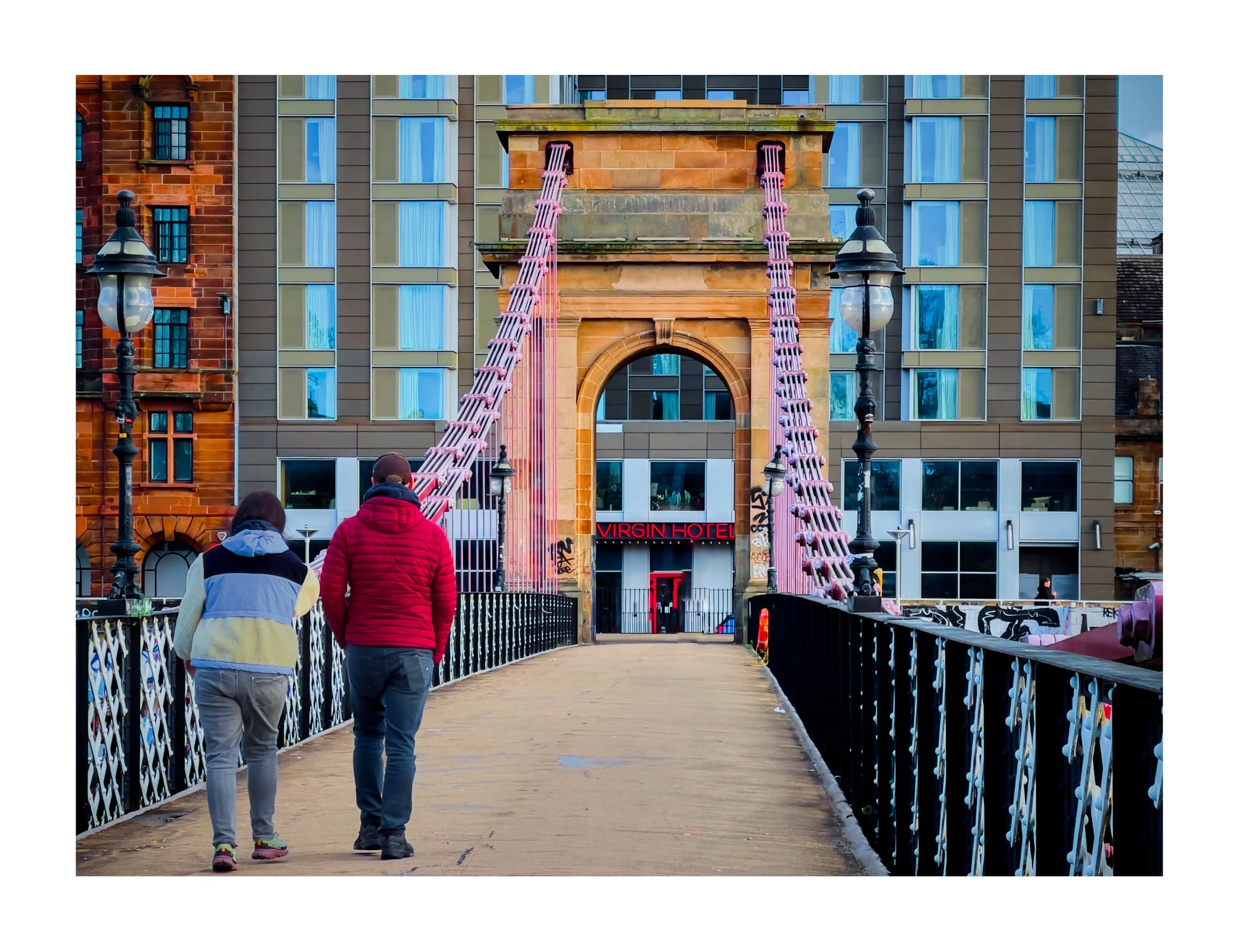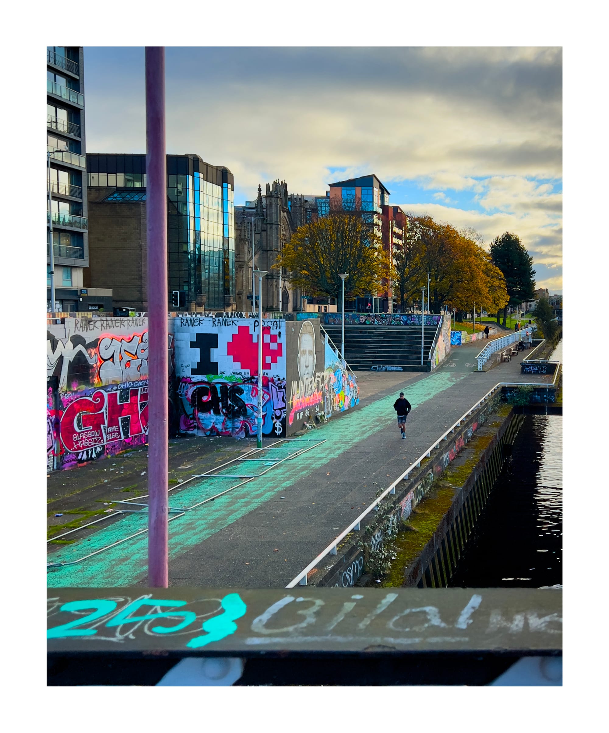 Left to right: A couple walking over the bridge on a Saturday morning. Runner next to the Clyde captured from the bridge. Block of buildings seen through the bridge's structure.