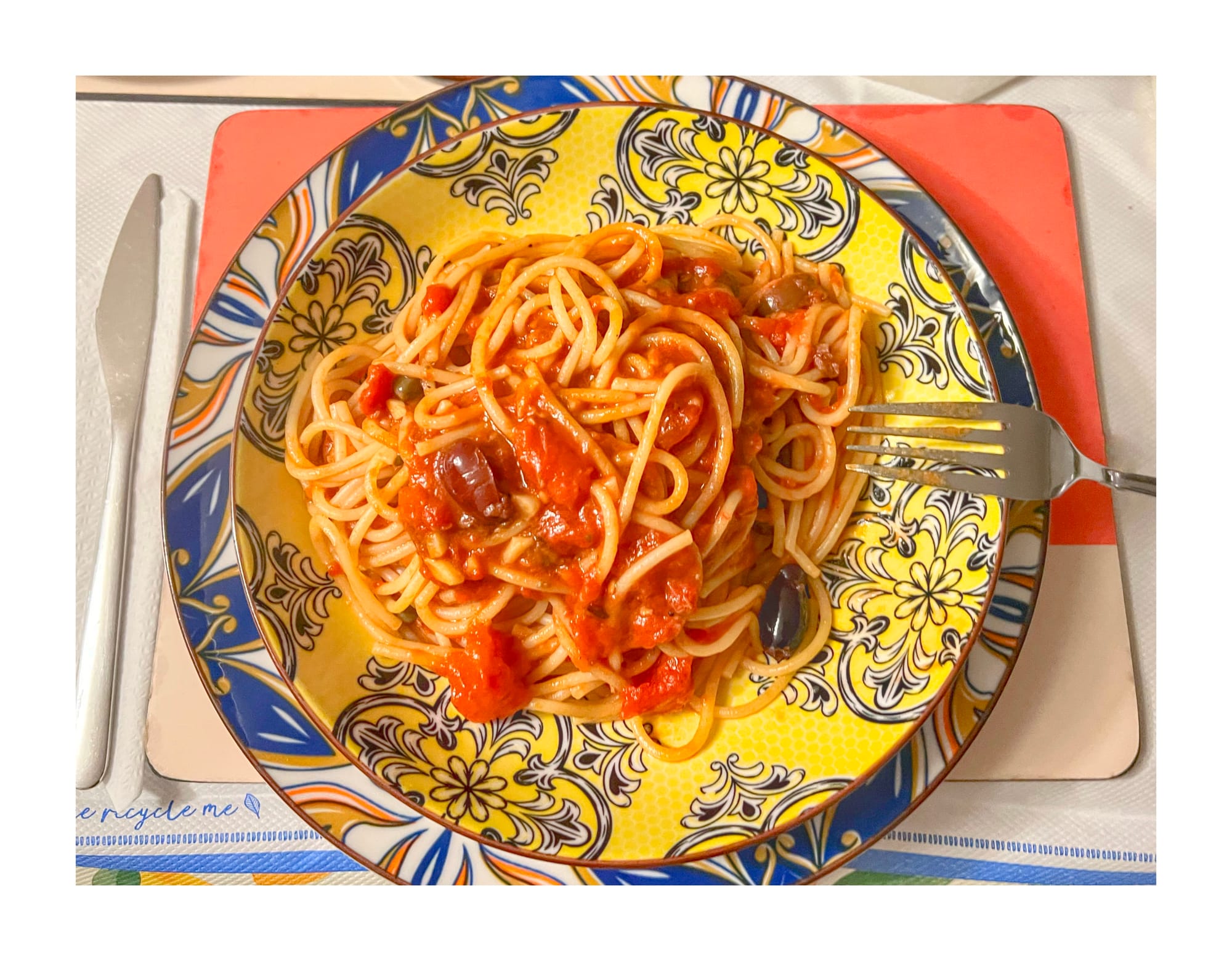 Pasta: Linguini, tomatoes, anchovies and black kalamata olives.